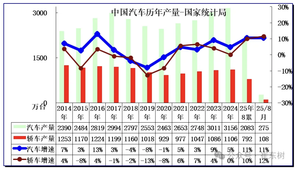 2025 年 1-8 月汽车生产 2083 万台,同比增 11%;新能源汽车生产 938 万台,同比增 31%,渗透率 45%;燃油车生产 1145 万台,同比降 2%。